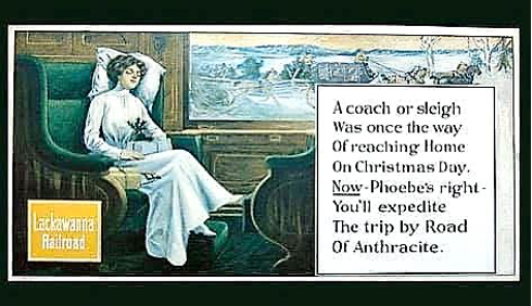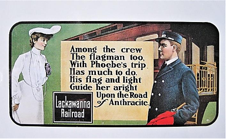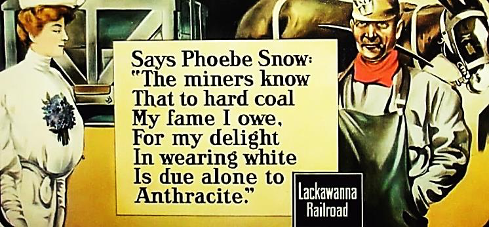 Phoebe Snow was a fictional character created by Earnest Elmo Calkins to promote the Delaware, Lackawanna and Western Railroad. The advertising campaign was one of the first to present a fictional character based on a live model amid impressionistic techniques. Rail travel around 1900 was tough on the clothing of passengers. After a long trip on a coal-powered train, travelers frequently would disembark covered with black soot, unless the locomotives were powered by anthracite, a clean-burning form of coal. The Lackawanna owned vast anthracite mines in Pennsylvania, and could legitimately claim that the clothes of their passengers would remain clean after a long trip.